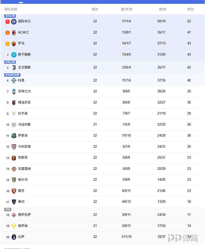 本轮意甲,米兰1-1战平罗马,尤文3-0大胜那不勒斯。目前国米52分第一,米兰近5轮3平,目前他们47分第二。罗马、那不勒斯43分排名第三和第四。尤文在本轮大胜后紧追前四,只有1分差距。
